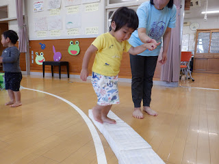 もも組はマットの坂、タンバリンタッチ、すずらんカーテンをくぐり、カエル号に乗ってゴールです!