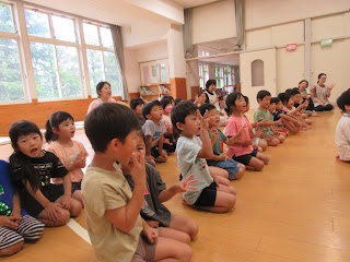 体操の後、幼児組はプールに移動してプール遊びの安全をお願いする「おはらい」をしました。園長先生がプールの角に塩を置いて清めてから、おはらいをしました。